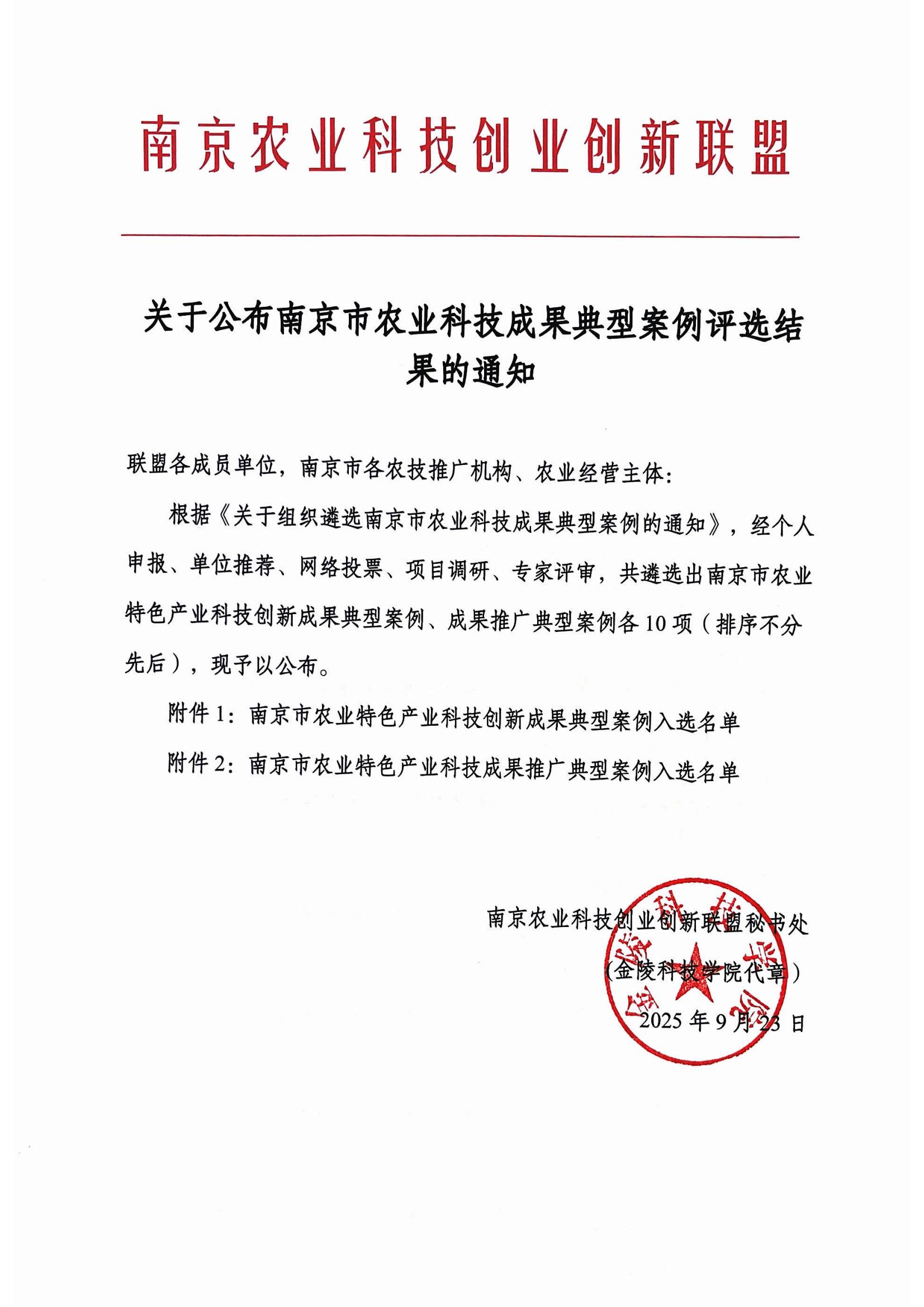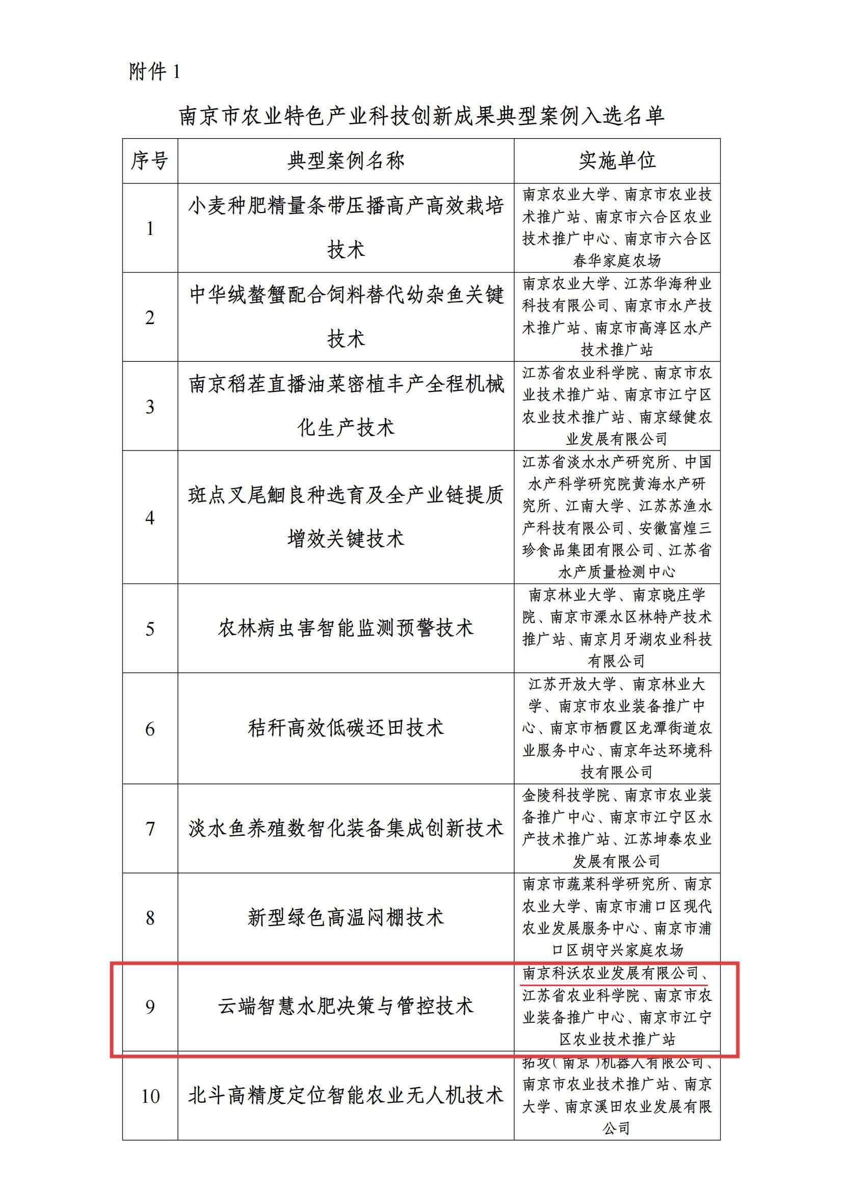 近日,南京农业科技创新联盟正式公布了《南京市农业科技成果典型案例评选结果》,我司实施的“【云端智慧水肥决策与管控技术】”成功入选“南京市农业特色产业科技创新成果/成果推广典型案例”。