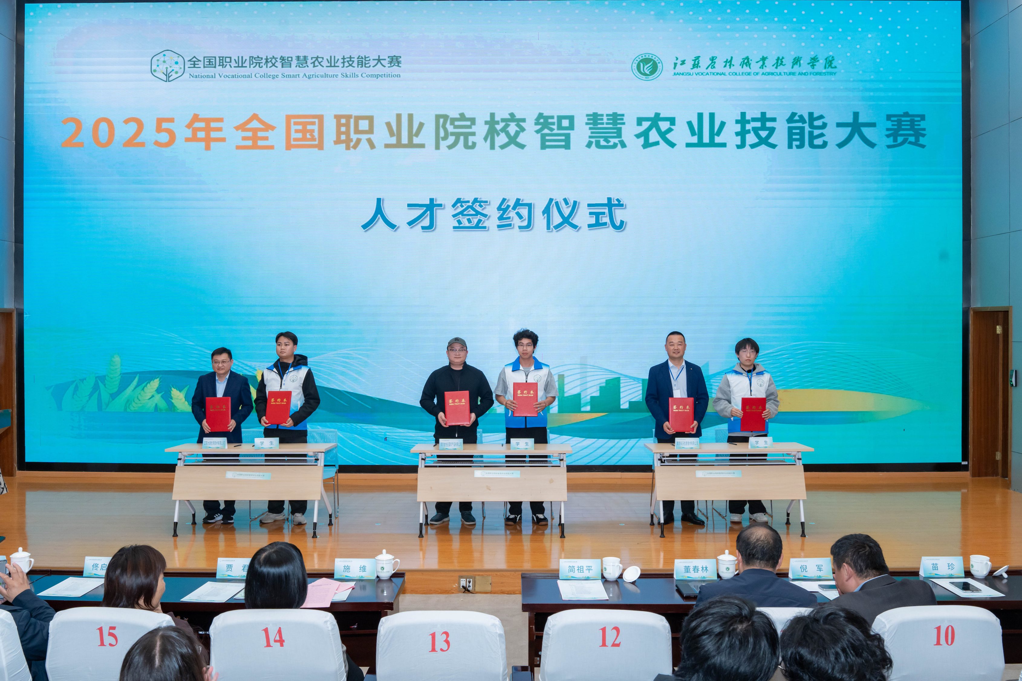 2025年10月31日至11月2日,全国职业院校智慧农业技能大赛决赛在江苏农林职业技术学院成功举办。我司作为大赛技术支持单位,全程提供可靠技术保障,助力赛事圆满落幕,赛后更与优秀获奖选手签约。本次大赛吸引60支参赛队伍同台竞技,各队伍在智慧农业创新平台上展开激烈角逐。为确保赛事平稳有序,我司技术团队全程驻场待命,高效完成设备调试、系统运维等前期筹备工作。比赛期间,团队快速响应突发问题,协助裁判组保障各环节流程顺畅,以专业服务获得组委会与参赛队伍的认可。11月1日晚,大赛闭幕式暨成绩发布会如期举行,组委会现场颁发多项荣誉奖项。颁奖仪式结束后,我司代表与优秀获奖选手现场签订人才签约协议。此次签约标志着公司在智慧农业领域人才储备战略中迈出关键一步,为企业技术创新与产业升级注入新鲜血液。