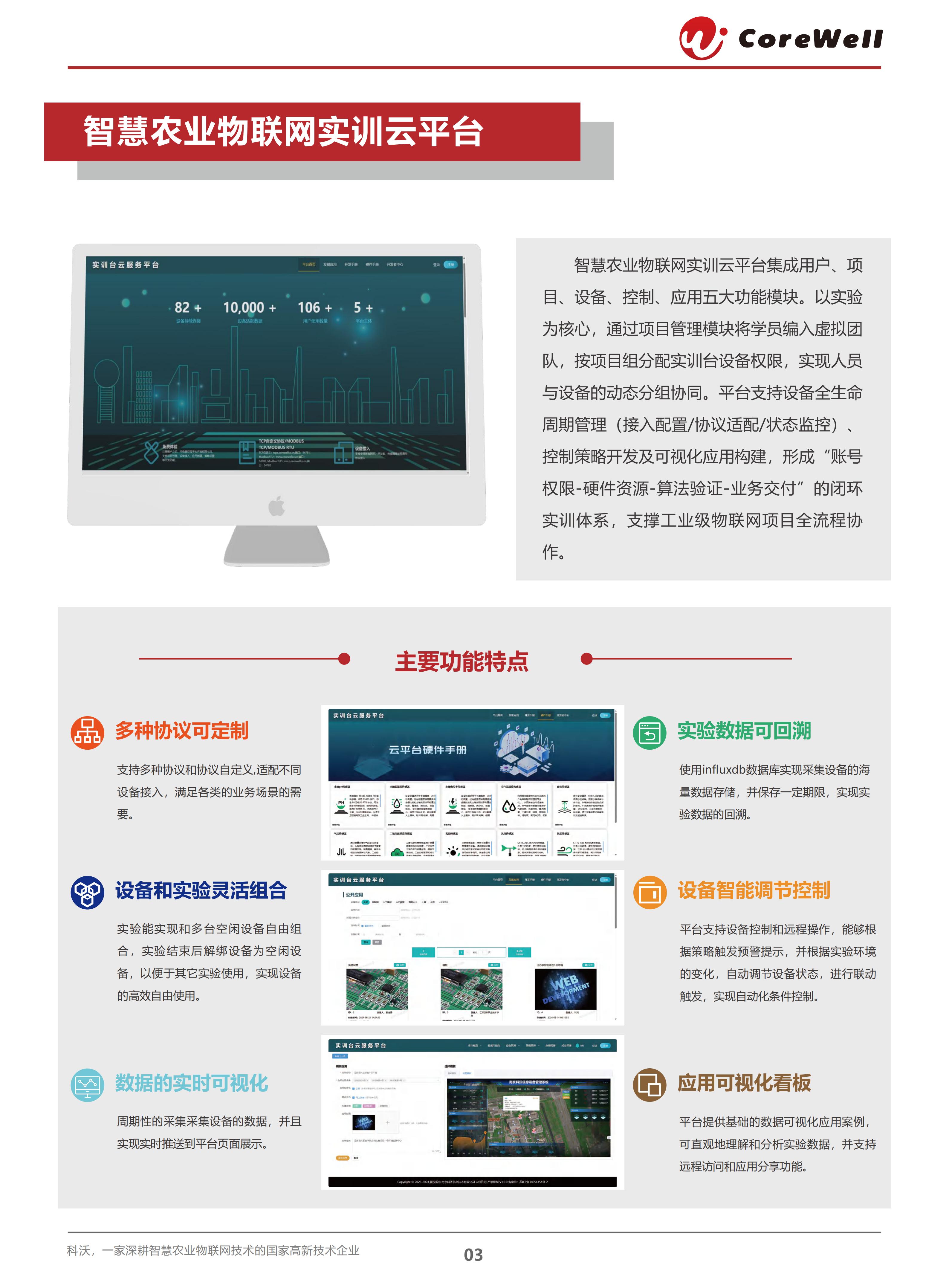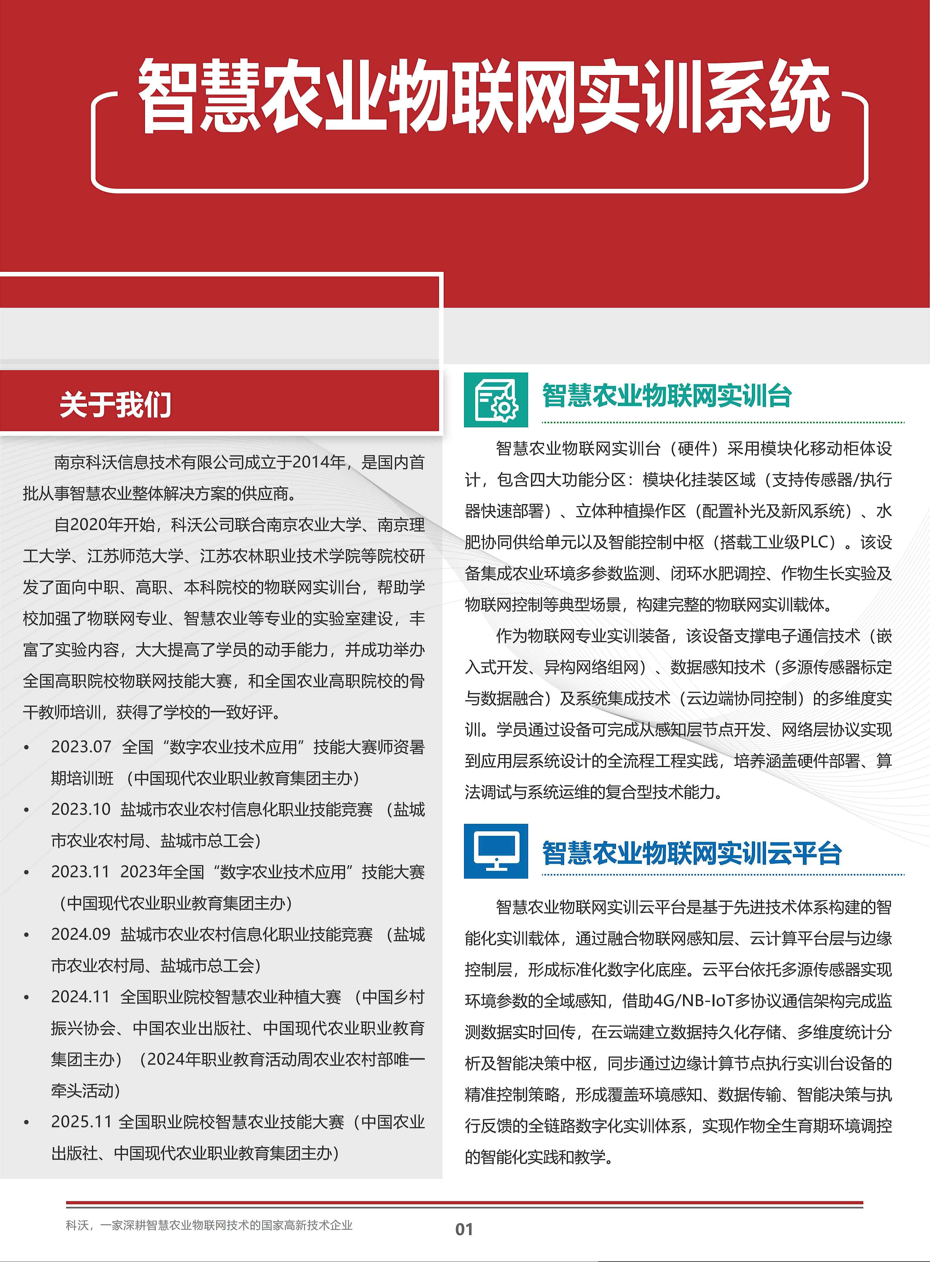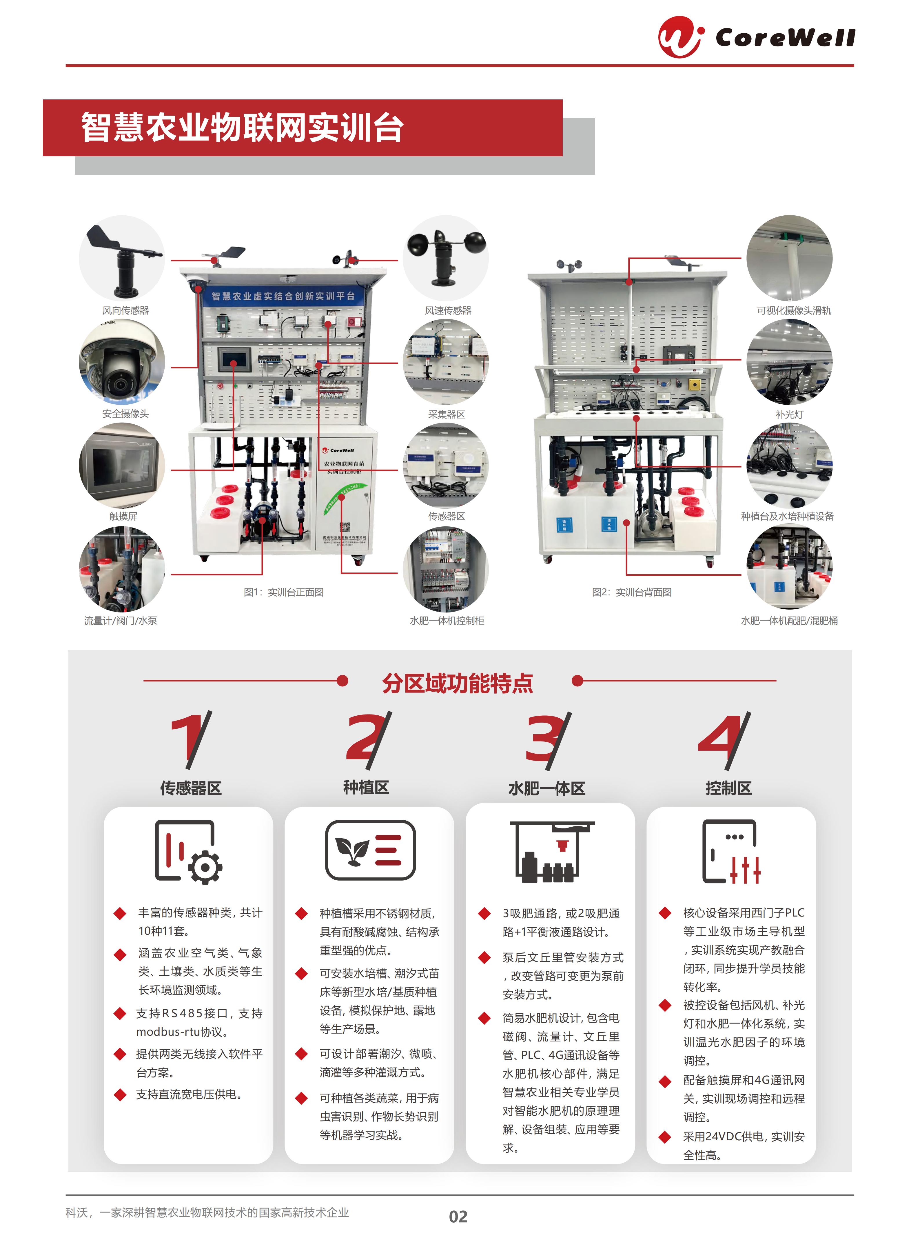 智慧农业物联网实训系统由硬件实训台与云平台构成。硬件实训台采用模块化移动柜体设计,集成了挂装区域(传感器/执行器)、立体种植区(含补光/新风)、水肥协同单元及智能控制中枢(工业PLC),支撑环境监测、水肥调控、生长实验等实训,覆盖嵌入式开发、网络组网、传感器标定、数据融合及云边端协同控制等电子通信、数据感知和系统集成技术实践,培养学员全流程(感知层开发、网络层协议、应用层设计)及硬件部署、算法调试与运维能力。云平台融合感知层、云计算与边缘控制层,通过多源传感器和4G/NB-IoT实现环境全域感知与数据传输,在云端提供数据存储、分析、智能决策,并通过边缘节点精准控制实训台设备,形成覆盖感知、传输、决策、执行全链路的数字化实训体系,实现作物全生育期智能化环境调控的教学实践。