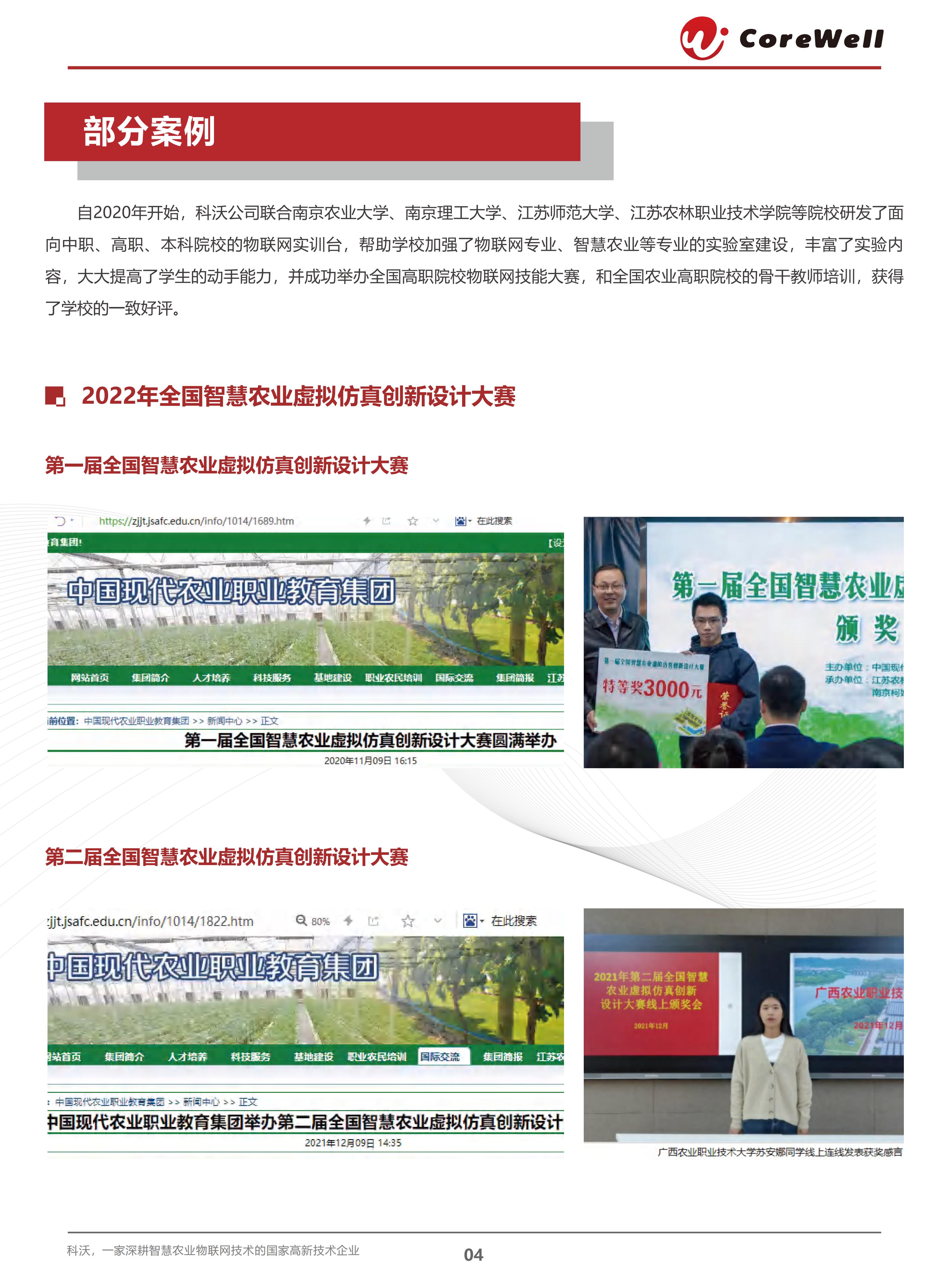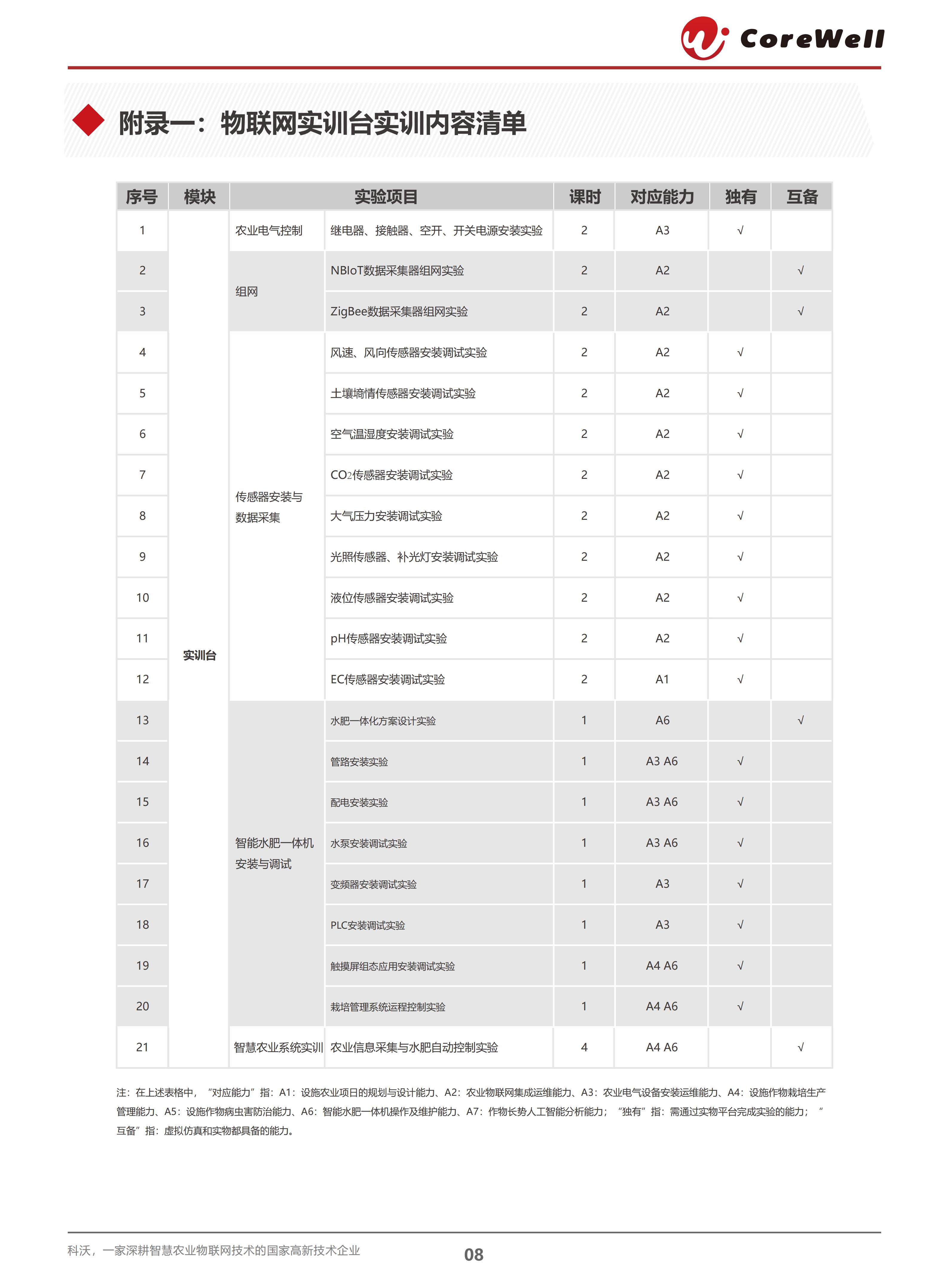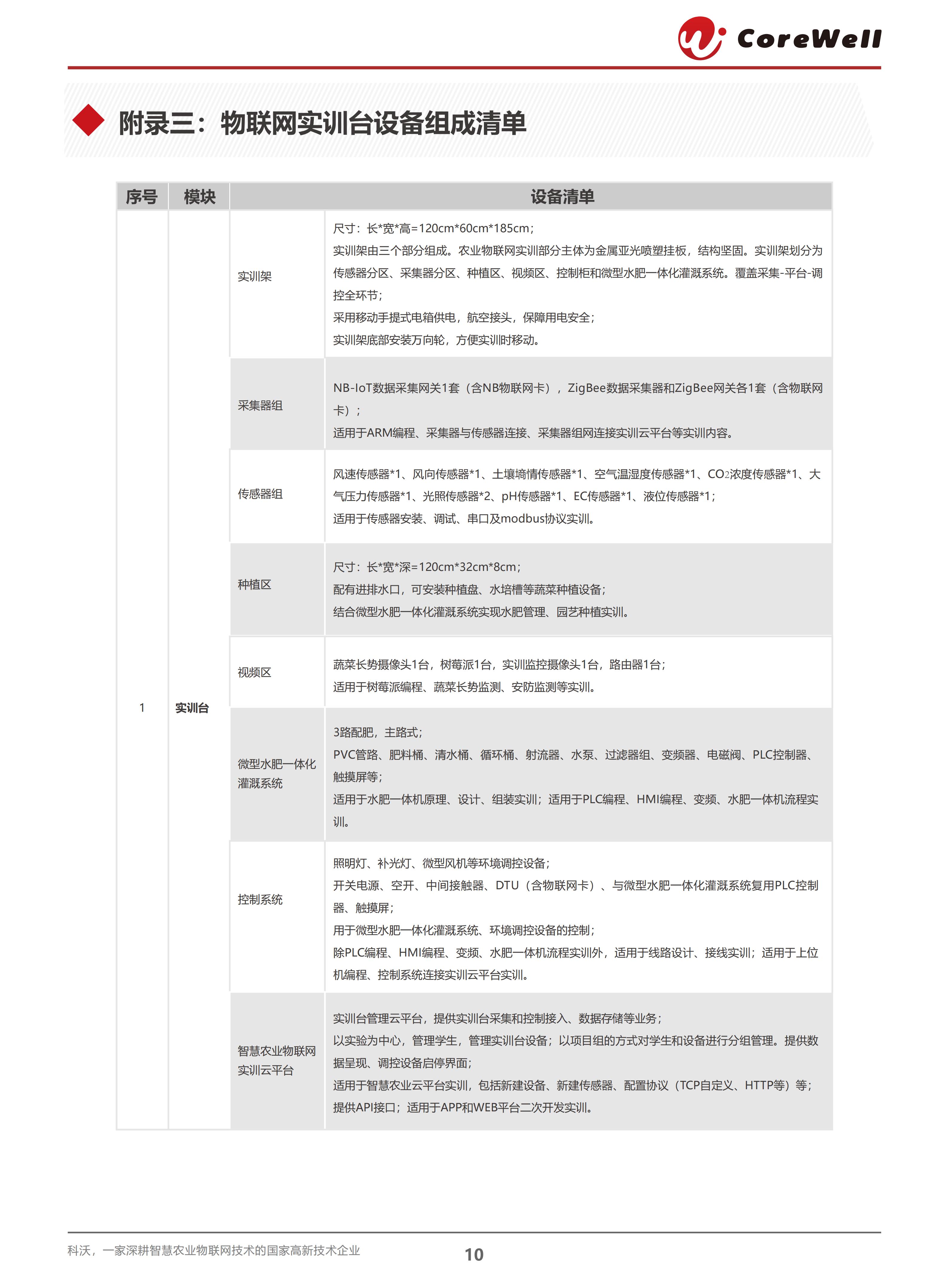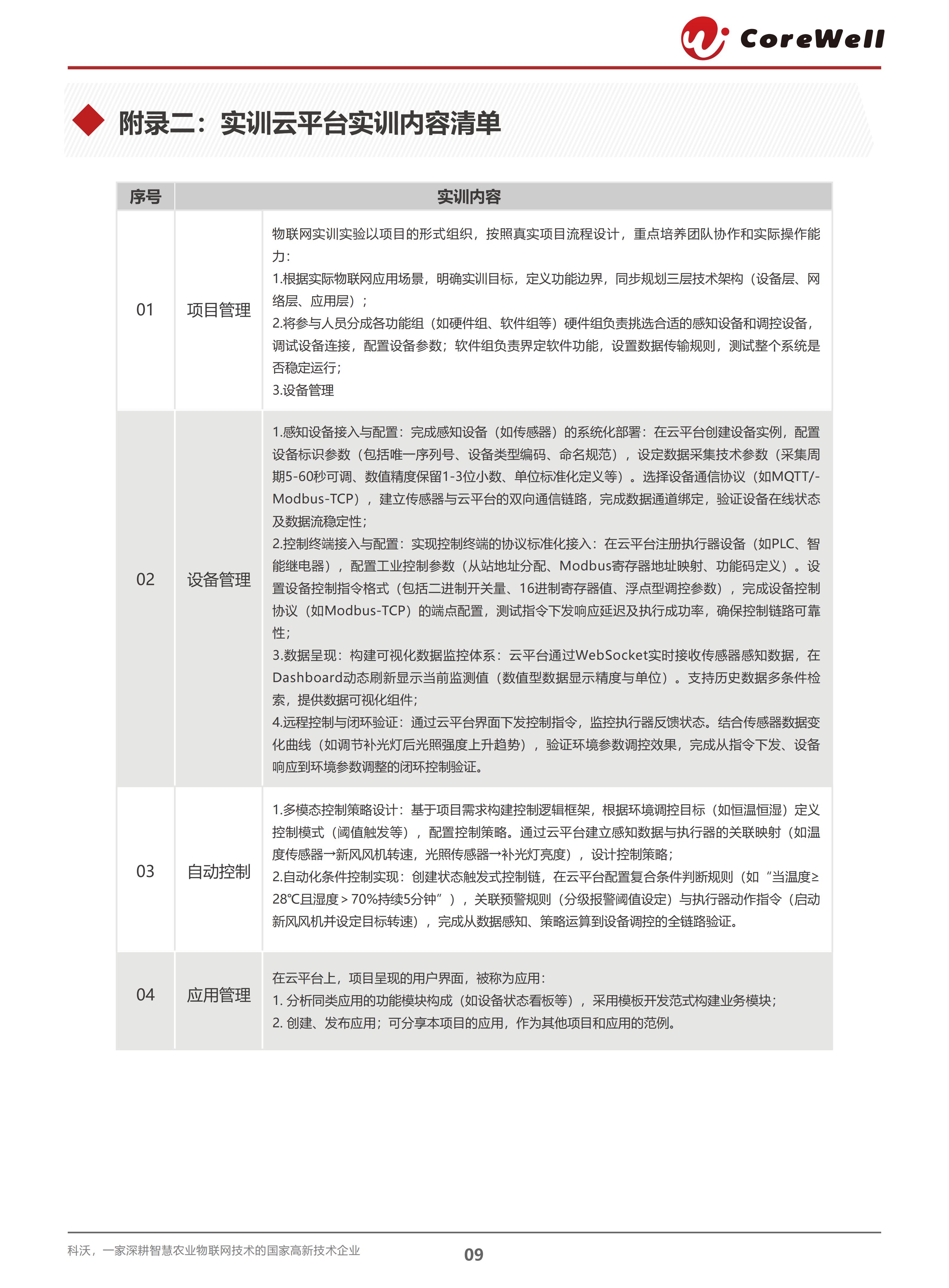 智慧农业物联网实训系统由硬件实训台与云平台构成。硬件实训台采用模块化移动柜体设计,集成了挂装区域(传感器/执行器)、立体种植区(含补光/新风)、水肥协同单元及智能控制中枢(工业PLC),支撑环境监测、水肥调控、生长实验等实训,覆盖嵌入式开发、网络组网、传感器标定、数据融合及云边端协同控制等电子通信、数据感知和系统集成技术实践,培养学员全流程(感知层开发、网络层协议、应用层设计)及硬件部署、算法调试与运维能力。云平台融合感知层、云计算与边缘控制层,通过多源传感器和4G/NB-IoT实现环境全域感知与数据传输,在云端提供数据存储、分析、智能决策,并通过边缘节点精准控制实训台设备,形成覆盖感知、传输、决策、执行全链路的数字化实训体系,实现作物全生育期智能化环境调控的教学实践。